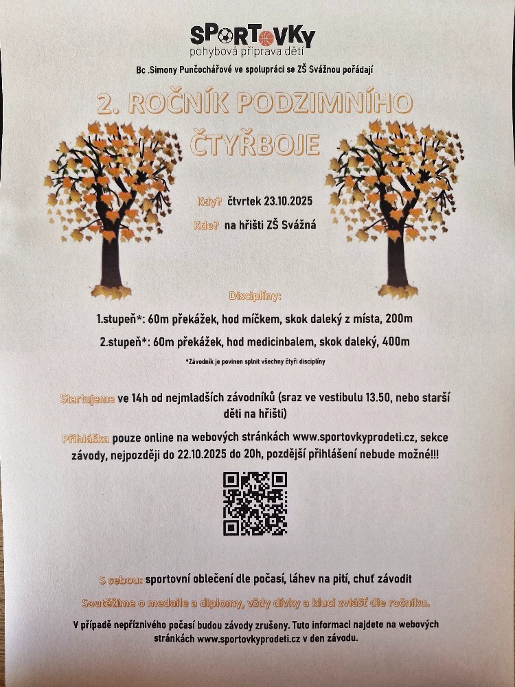Organizační informace: pokud dítě na závod půjde z družiny, je nutné tuto informaci napsat do družinového deníčku. Předpokládaný konec pro 1.stupeň do 15:30, pro 2.stupeň 16:30.